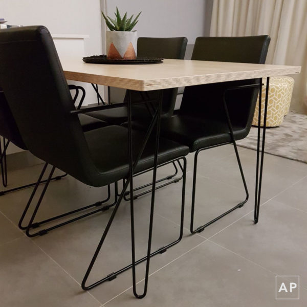 MATERIAL: Tabletop – Made from 18mm/27mm thick Birch Plywood protected with water resistant varnish. Table legs – Made with 10mm solid steel rod, welded on a 4mm thick “L” bracket. Powder coated in White, Black, Dark Grey, Yellow or Red. Can also be QD Enameled in a specific colour of your choice, please contact us for more information.